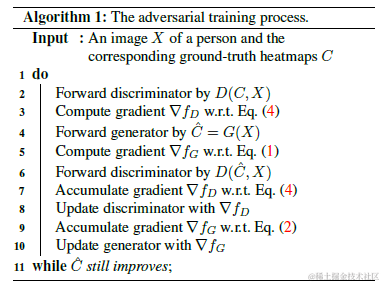 4.有了虚假热度图C^和D(X,C^),利用公式2计算对抗loss,Ladv,并更新生成器。