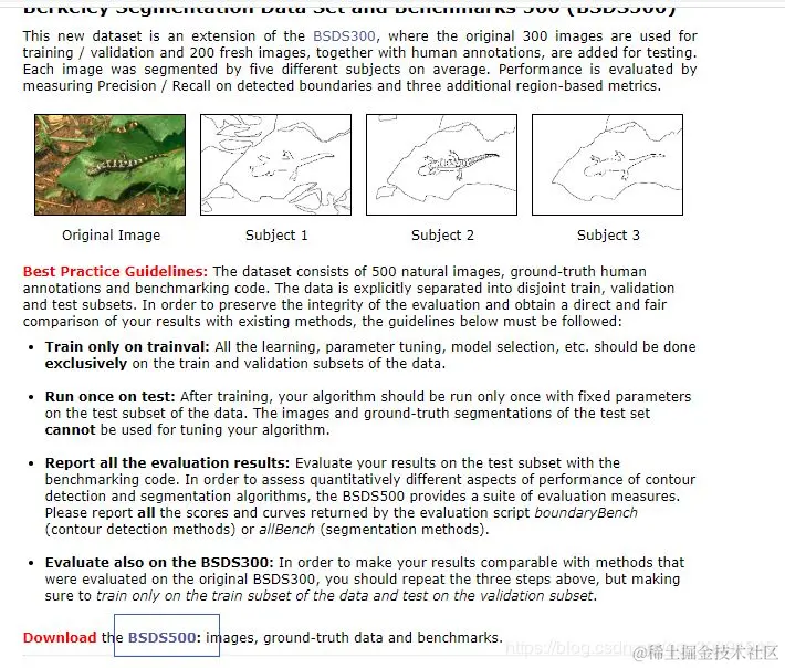 MNIST-M数据集由MNIST数字与BSDS500数据集中的随机色块混合而成。那么要生成MNIST-M数据集,请首先下载BSDS500数据集。BSDS500数据集的官方下载地址为:BSDS500。以下是BSDS500数据集官方网址相关截图,点击下图中蓝框的连接即可下载数据。\