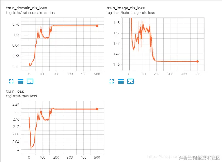 下面是训练过程中的相关tensorboard的相关指标在训练过程中的走势图。首先是训练误差的走势图,主要包括训练域分类误差、训练图像分类误差和训练总误差。\