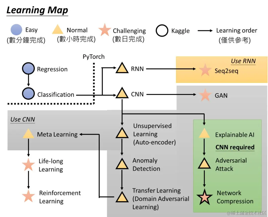 与其它只教授机器学习基础内容不同,按照惯例,李宏毅老师还会特别讲解当前最新的算法,并将其作为补充视频上传到网上。而且,李宏毅老师的课程涉及领域非常完整,从有监督、半监督、无监督到强化学习,都会有介绍。在最新的 2020 ML 课程中,他展示了完整的学习路径。