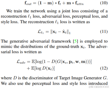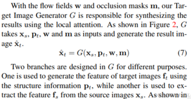 值得注意的是,由于源姿势图像可能出现一些遮挡和移动,并非可以都找到目标图像的所有内容。为了使目标图像生成器G补充生成新内容,遮挡掩模m(在0和1之间)具有特征选择的作用。下面给出其处理方式以及剩余的损失函数: