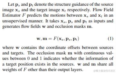 接收(原姿势图像、原姿势结构、目标姿势结构图像)为输入,输出流场w(包含坐标偏移信息)和遮挡掩膜m(指示目标位置信息是否在原图中存在):