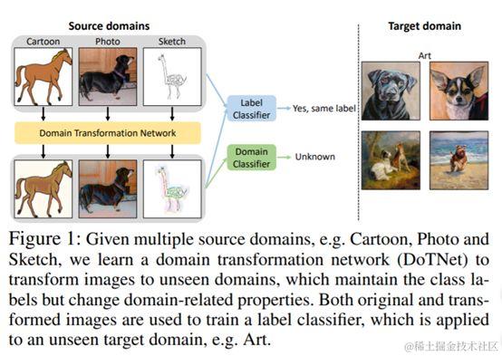 例如下图,源域只有卡通、自然图像、草图三类数据,通过域转换网络得到类标签不变但域标签已经改变的合成数据,合成数据对源数据扩充后再训练分类器,可以泛化到未知域(如艺术?)的正确分类。
