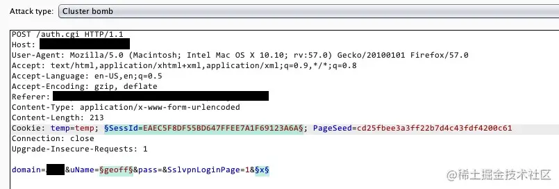 这对于使用Sniper(Intruder标签内的一种攻击类型)的password spray攻击(未展示)是非常理想的,然而对于Cluster bomb(Intruder标签内的另一种攻击类型),Burp对每组仅运行一次有效载荷处理器。我不知道sessId是否可以在此设备上用于重复多次登录,所以这可能是这种暴力破解方法的一个问题,虽然我没有看到任何输出来表明这一点。我只做了一些Repeater实验,表明会话在几秒钟后过期。