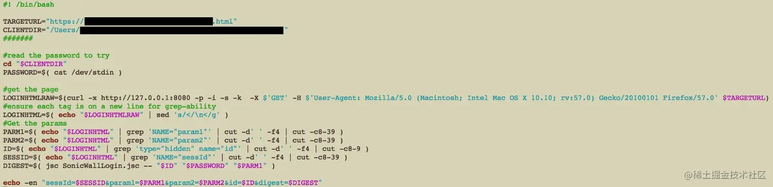 现在我需要一种获取值的方法!我在Burp中使用了“copy-as curl”,并将结果合并到一个很小的shell脚本中。这个脚本将是我从扩展中调用的实际命令,它将随后调用jsc运行里面的JavaScript代码。最后,它将会合并输出,并且最后的结果便于用作Intruder有效载荷:
