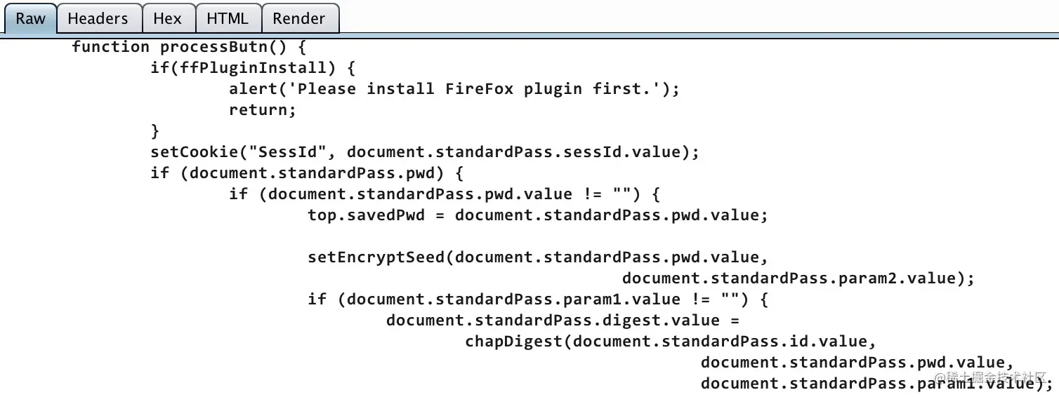 它设置了几个cookie,并计算出一个CHAP响应。查看chapDigest()函数,我发现表单中的param1和id值从ASCII十六进制转换为字节,并与密码拼接,最后生成一个md5和并转换回ASCII十六进制。这不是非常复杂,但是跨越了两个请求,sessId也从表单字段移动到了cookie中,而且我不太想深入理解Burp内部机理。