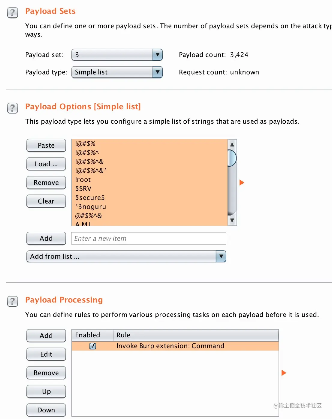 最后,在Payload set 3设置了我的密码列表,并且使用我的自定义有效载荷处理器“Command”: