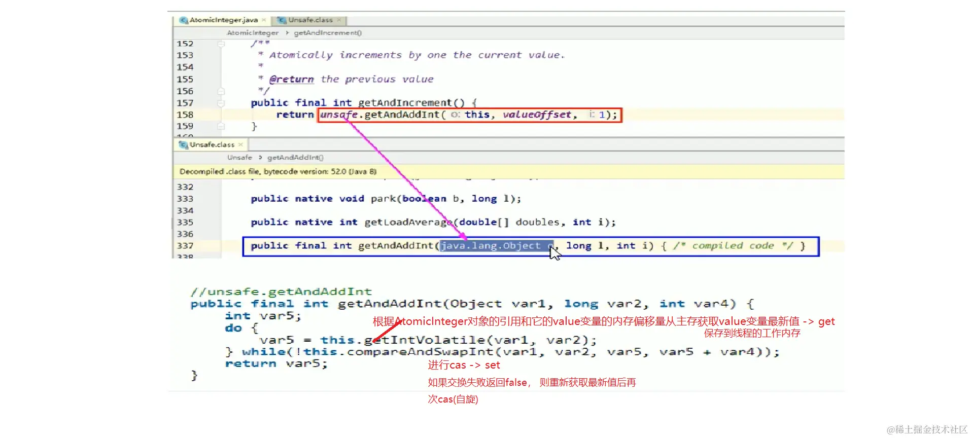 以AtomicInteger为例,Unsafe通过value变量内存偏移量在主内存中定位到value变量然后进行CAS操作。