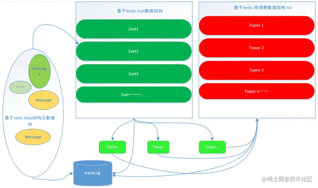 redis作为数据缓存的主要原因是因为redis自身支持zset的数据结构(score 延迟时间毫秒) 这样就少了排序的烦恼而且性能还很高,正好我们的需求就是按时间维度去判定执行的顺序 同时也支持maplist数据结构。