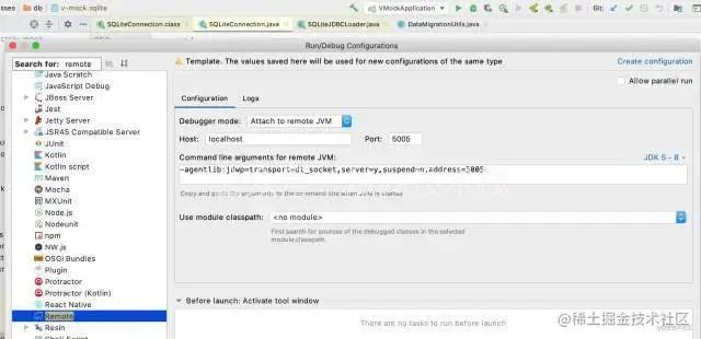 从configuration中搜索remote模版,点击右上角的create configuration,就创建好了一个远程debug启动方式.
