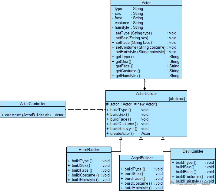 Actor:游戏角色类,充当复杂产品对象ActorBuilder:游戏角色建造者,充当抽象建造者HeroBuilder:英雄角色建造者,充当具体建造者AngelBuilder:天使角色建造者,充当具体建造者DevilBuilder:恶魔角色建造者,充当具体建造者ActorController:角色控制器,充当指挥者Client:客户端测试类