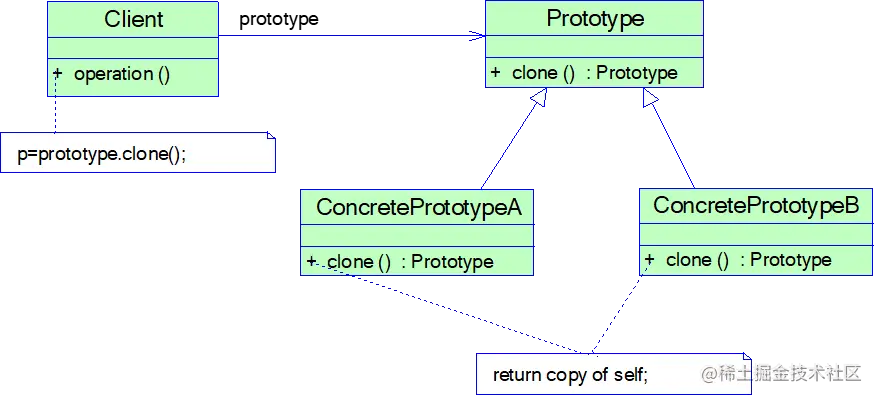 - 创建新对象(也称为克隆对象)的工厂就是原型类自身,工厂方法由负责复制原型对象的克隆方法来实现