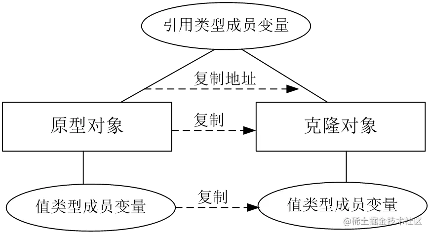 浅克隆(Shallow Clone): 当原型对象被复制时,只复制它本身和其中包含的值类型的成员变量,而引用类型的成员变量并没有复制。
