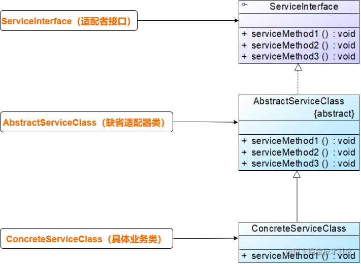 定义:缺省适配器模式(Default Adapter Pattern):当不需要实现一个接口所提供的所有方法时,可先设计一个抽象类实现该接口,并为接口中每个方法提供一个默认实现(空方法),那么该抽象类的子类可以选择性地覆盖父类的某些方法来实现需求,它适用于不想使用一个接口中的所有方法的情况,又称为单接口适配器模式。