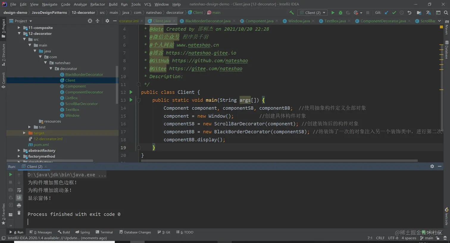 Component:抽象界面构件类,充当抽象构件类Window:窗体类,充当具体构件类TextBox:文本框类,充当具体构件类ListBox:列表框类,充当具体构件类ComponentDecorator:构件装饰类,充当抽象装饰类ScrollBarDecorator:滚动条装饰类,充当具体装饰类BlackBorderDecorator:黑色边框装饰类,充当具体装饰类Client:客户端测试类