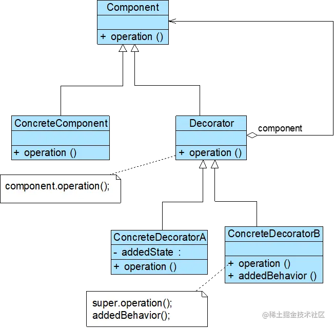 Component(抽象构件)ConcreteComponent(具体构件)Decorator(抽象装饰类)ConcreteDecorator(具体装饰类)