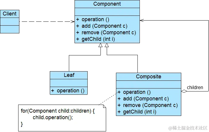抽象构件Component中没有声明任何用于管理成员对象的方法,而是在Composite类中声明并实现这些方法