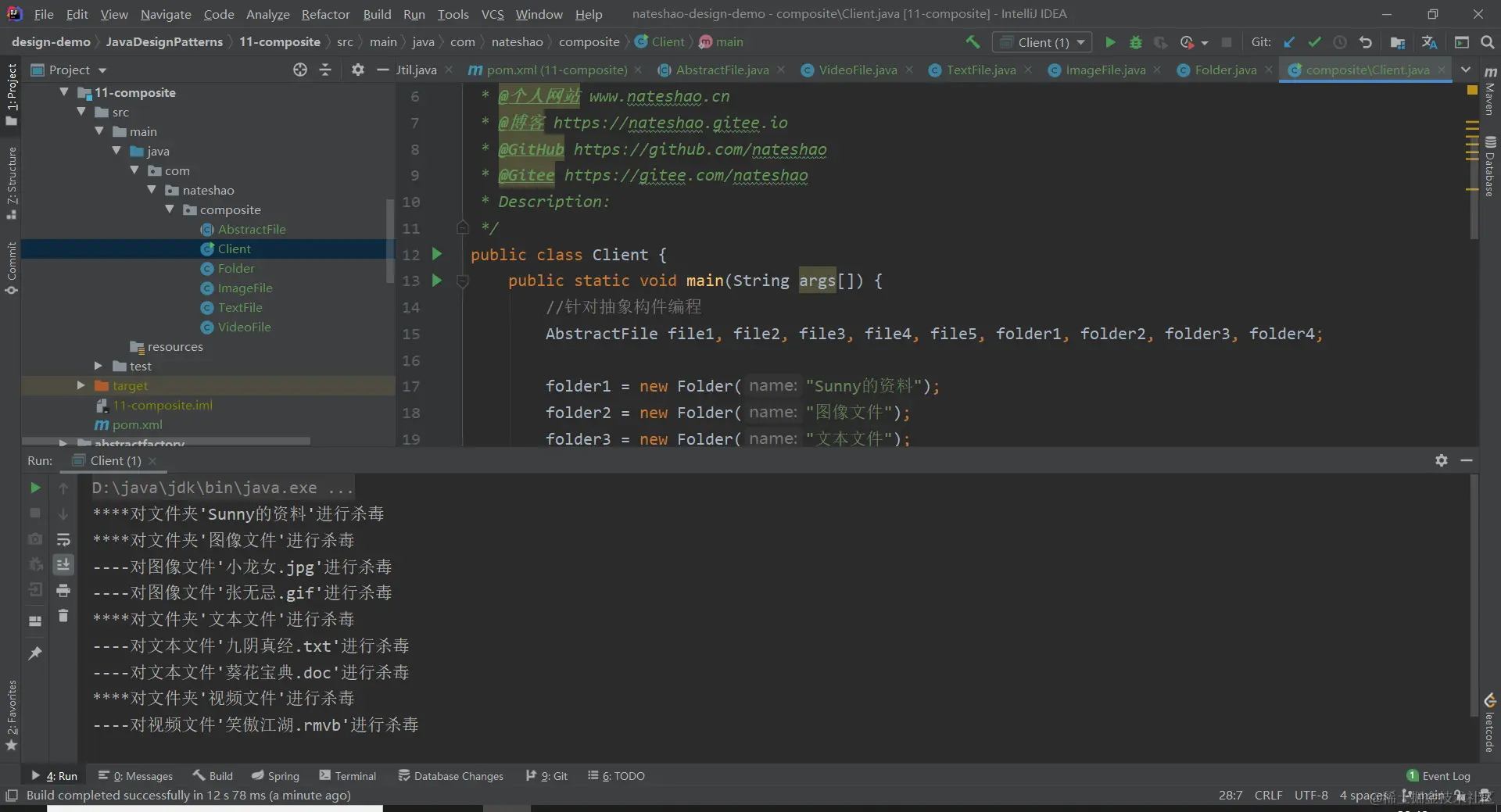 AbstractFile:抽象文件类,充当抽象构件类ImageFile:图像文件类,充当叶子构件类TextFile:文本文件类,充当叶子构件类VideoFile:视频文件类,充当叶子构件类Folder:文件夹类,充当容器构件类Client:客户端测试类