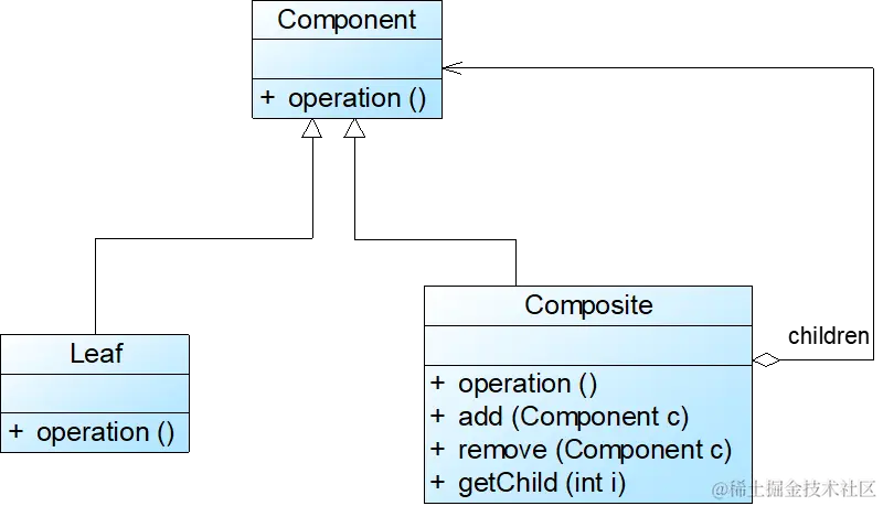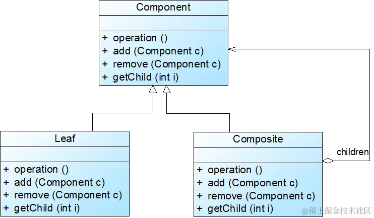 抽象构件Component中声明了所有用于管理成员对象的方法,包括add()、remove(),以及getChild()等方法