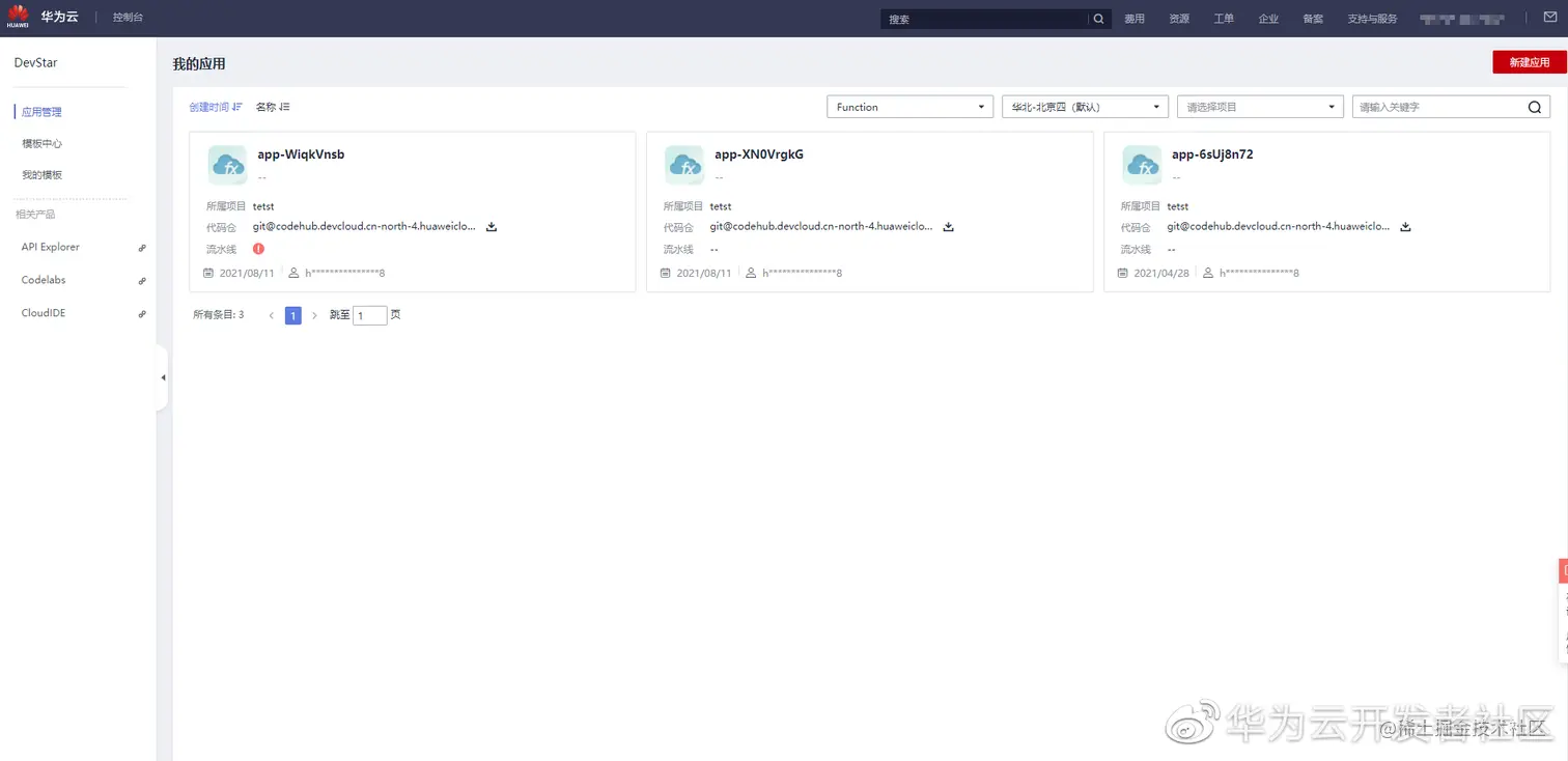 在DevStar首页左侧菜单找到“应用管理”入口,点击进入: