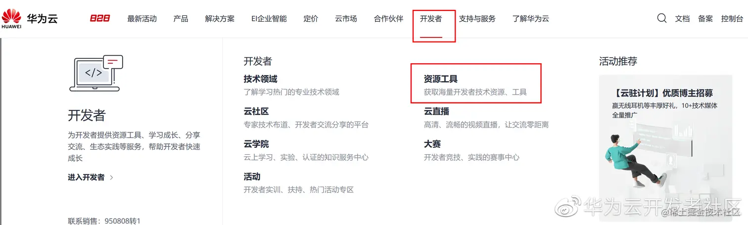 选择“开发者 -> 资源工具”,进入“华为云开发者工具”中: