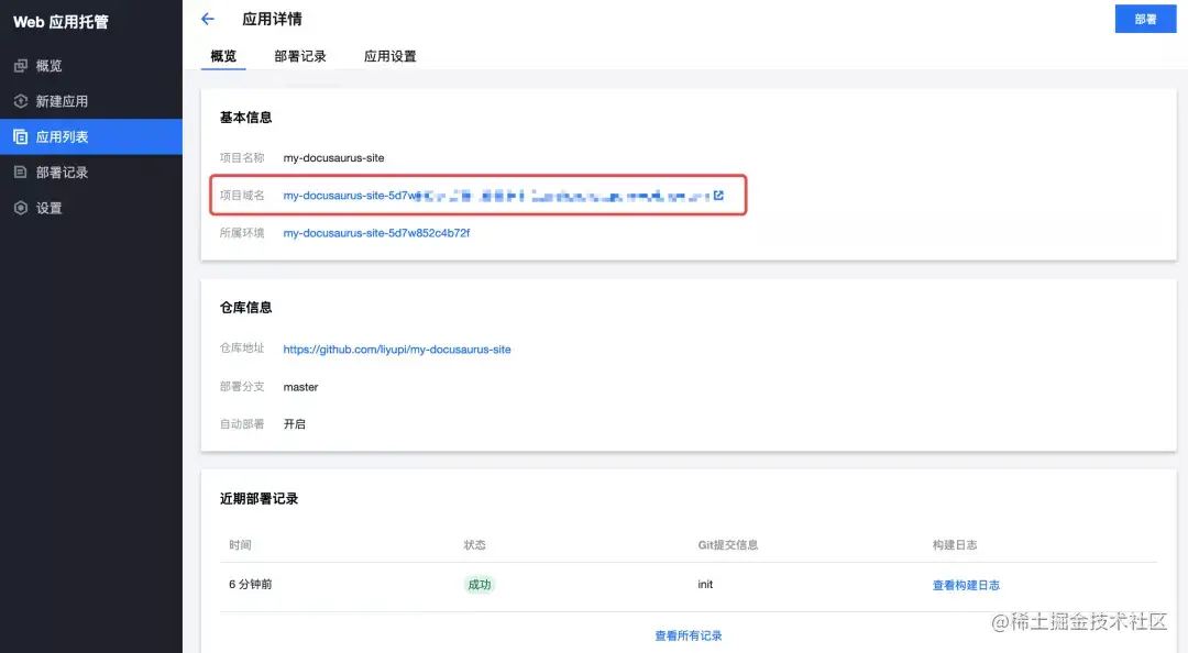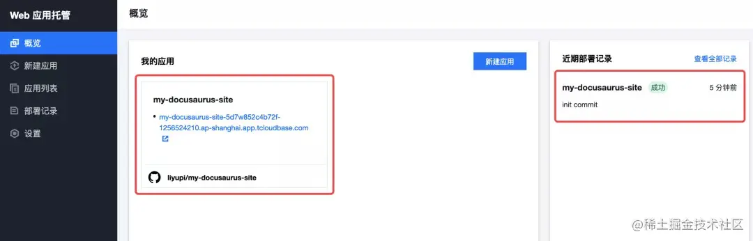 可以在应用列表和部署记录中查看到新建完成的应用: