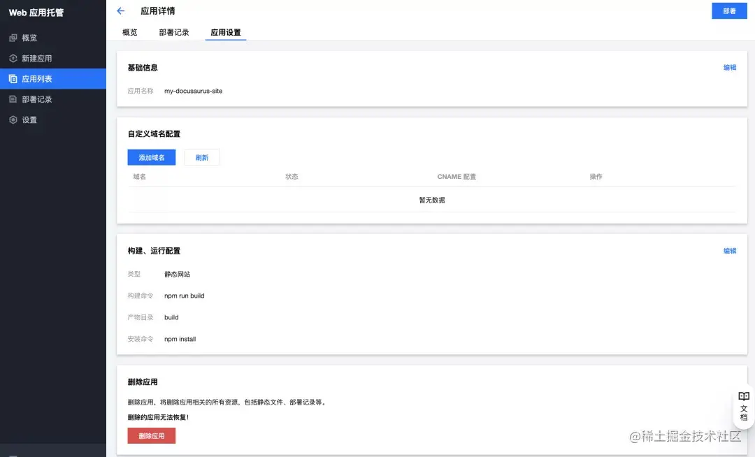 进入应用详情的设置页,可以给项目添加自定义域名、修改应用构建配置、删除应用等: