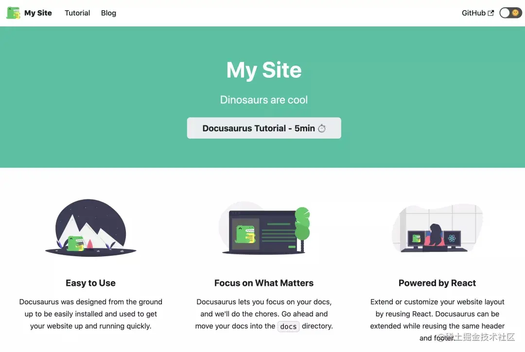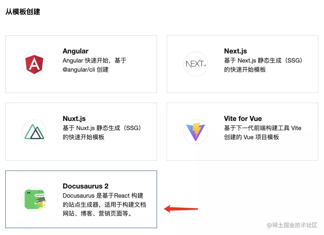 也没有关系,Webify 内置了一些项目模板,直接选择需要的应用创建即可。比如我们要做个人博客,可以选择 Docusaurus 2 这款主流的站点生成器: