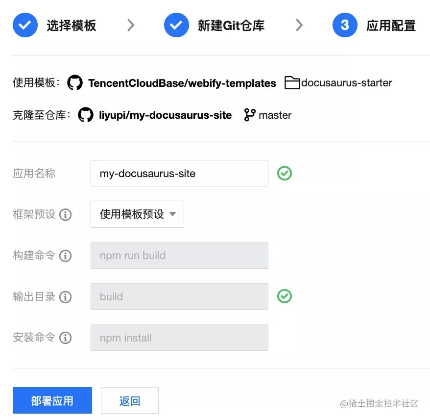 点击下一步,进入应用配置,由于我们使用的是系统预设模板,什么都不用改,用默认配置就行了。