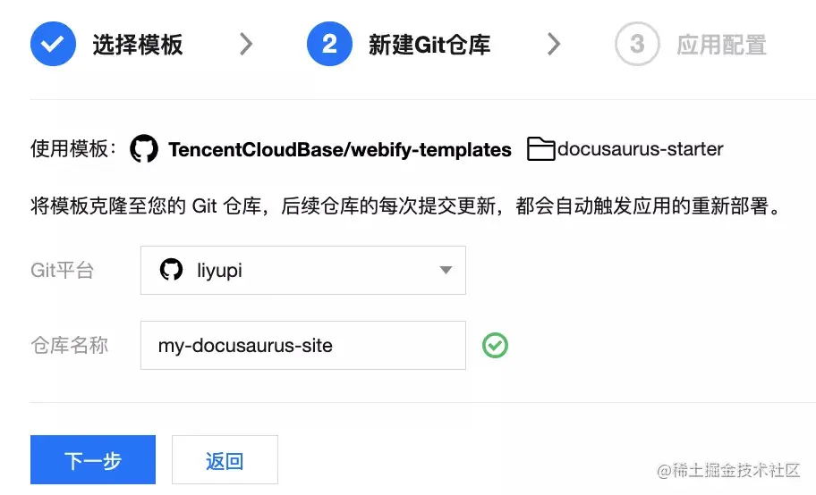 选中模板后,系统会自动把代码模板复制到新的 Git 仓库,和应用关联。