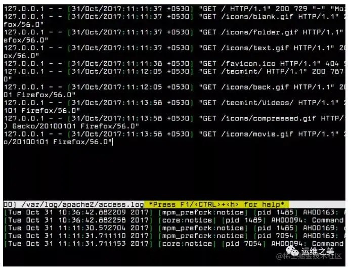使用下面命令可以在基于 Debian 或 RedHat 的系统中安装 Mulitail。$ sudo apt install multitail [On Debian & Ubuntu] $ sudo yum install multitail [On RedHat & CentOS] $ sudo dnf install multitail [On Fedora 22+ version]下面例子演示了如何同时显示两个日志文件。