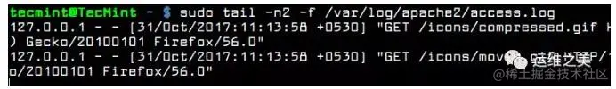 然而,默认情况下 tail 命令只会显示文件最后 10 行的内容。如果你只想在实时模式下查看最后两行的内容,那么可以连用 -n 和 -f 参数,如下这样: