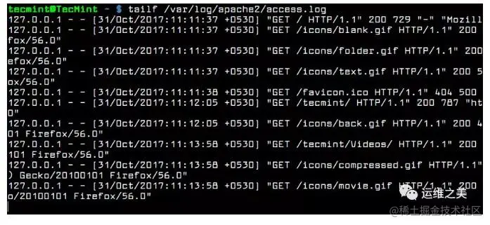 第二个例子就是 tailf 命令。它本身内建了 -f 参数,因此你无需再为它指定 -f 参数。