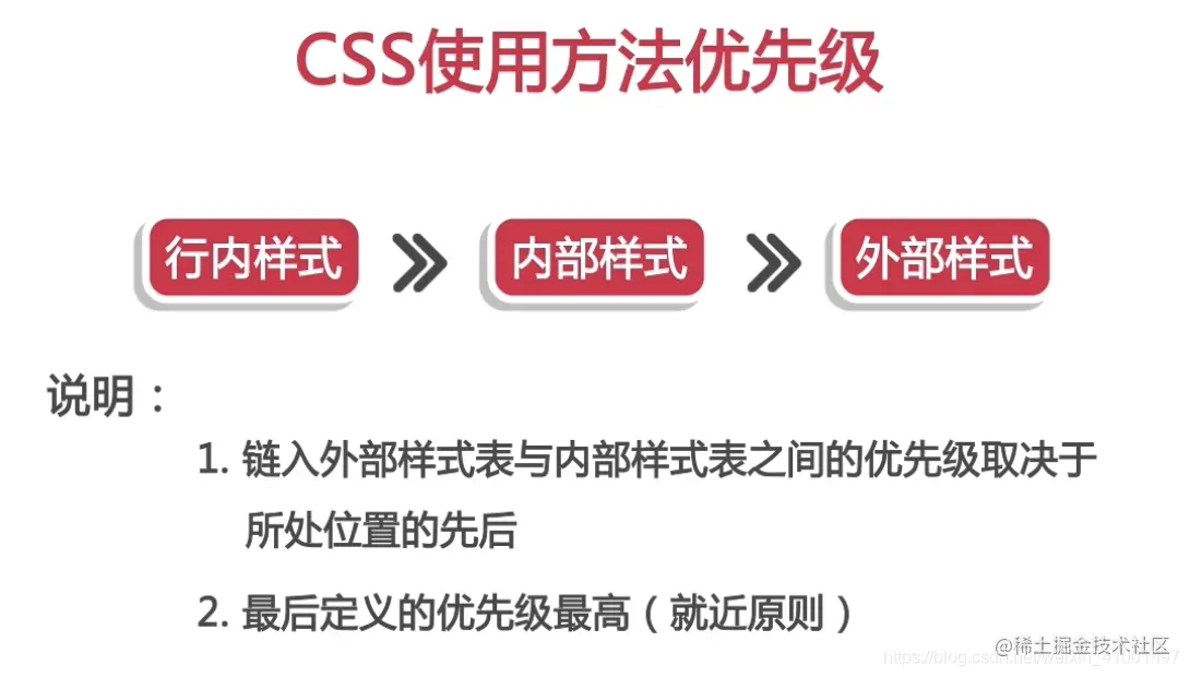 对于同一个元素,使用多种css方法,优先级为行内样式>内部样式>导入样式?外部样式(谁离所设置的元素越近,谁优先级越高)