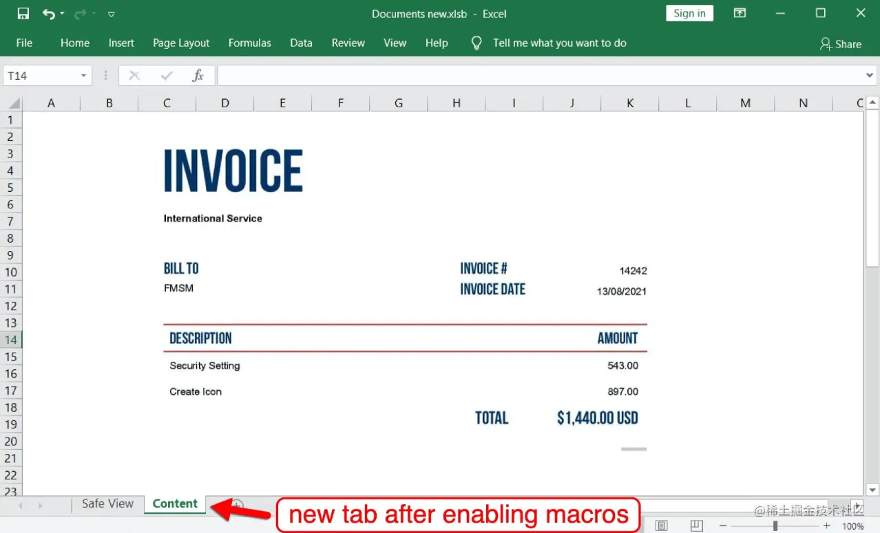 攻击者试图通过利用DocuSign来迷惑受害者。受害者Windows主机上启用恶意宏后,表格中会出现新的sheet,如下图所示: