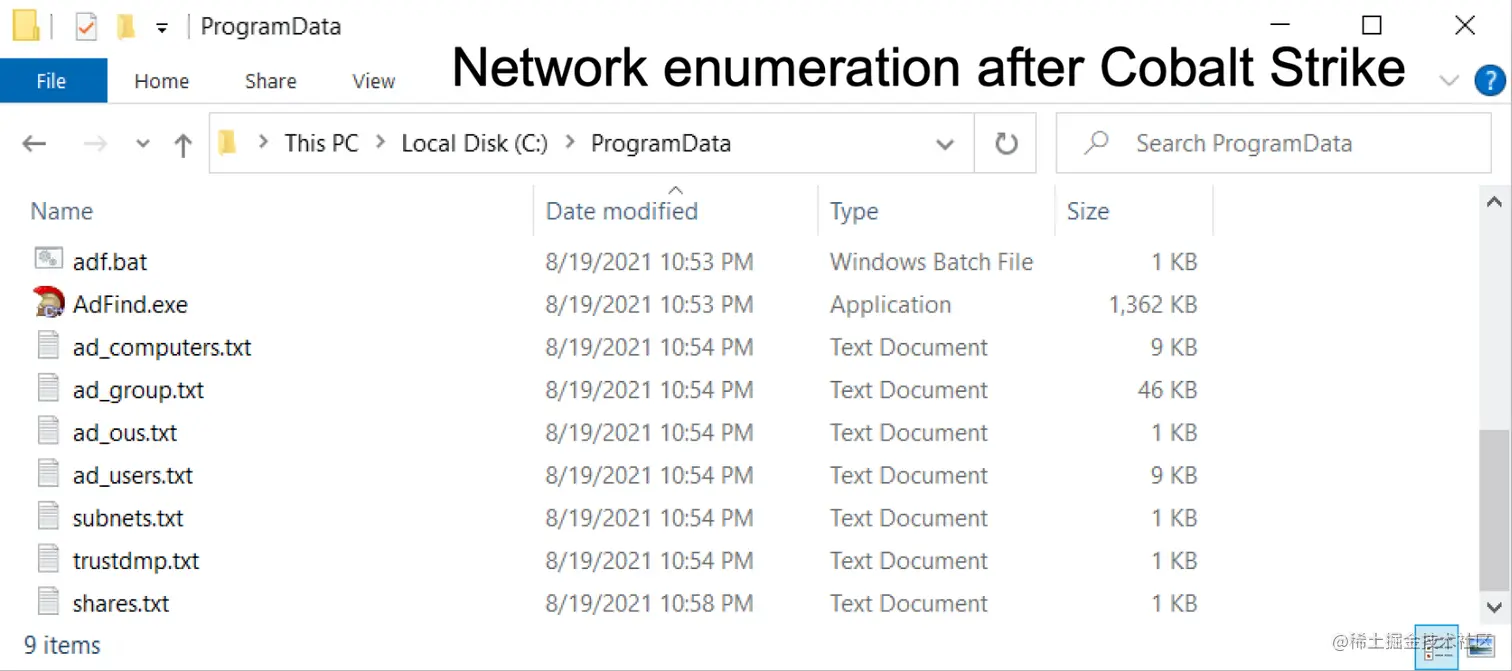 Cobalt Strike运行两分钟后,环境信息采集工具会下载到受感染主机上‘C:\ProgramData\AdFind.exe’。