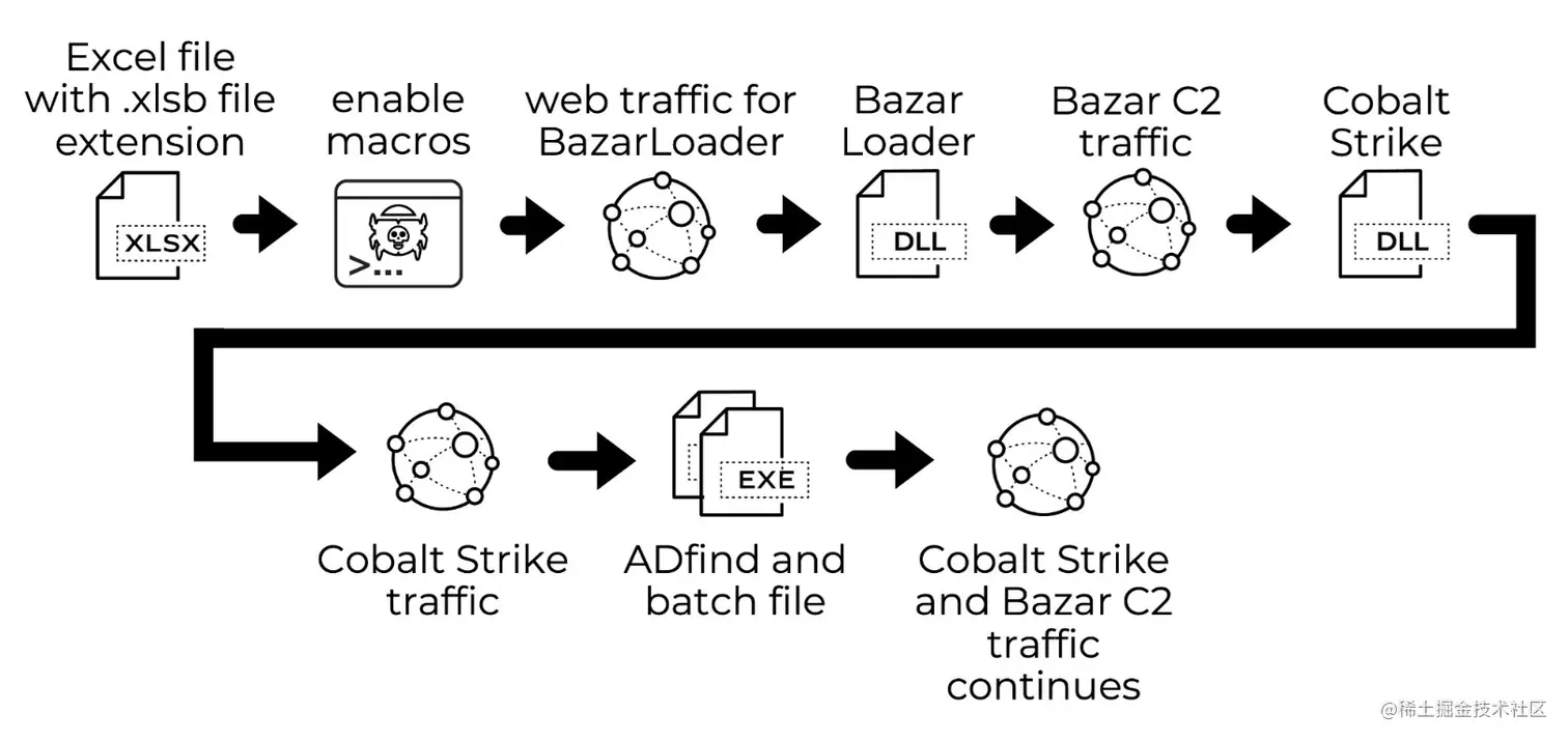 除了这三个主要攻击活动外,研究人员还发现了含有BazarLoader的Excel电子表格,其传播感染方式如下: