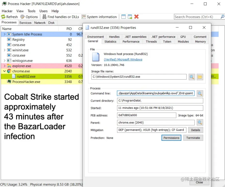 通过Bazar C2获得Cobalt Strike DLL文件,保存到AppData\Roaming目录下,下图为正在运行的Cobalt Strike: