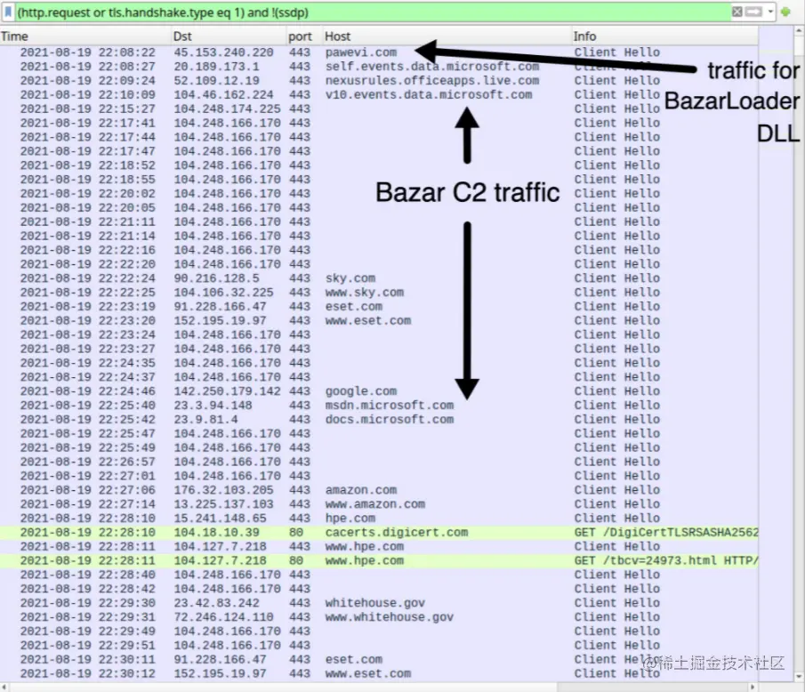 样本BazarLoader通过443端口从104.248.174.225下载BazarBackdoor。BazarBackdoor通过443端口使用HTTPS生成C2活动,传输至104.248.166.170。