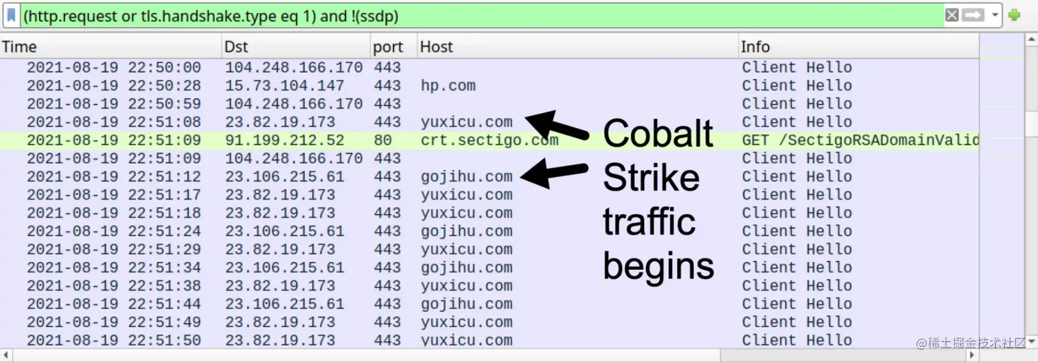 BazarLoader感染大约41分钟后,受感染Windows主机通过https与gojihu[.]com和yuxicu[.]com下载运行Cobalt Strike,如下图:
