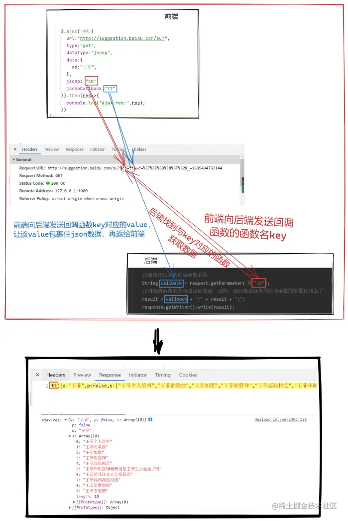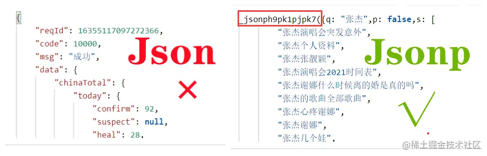 众所周知,后端一般给前端返回json数据,而使用Jsonp的特殊之处就在于前端会传递一个callback参数(key)给后端,接着后端返回数据时会将这个callback参数的值(value)作为函数名来包裹住json数据,最终返给前端的就是一段js代码了,这样就巧妙地解决了跨域的问题✨。