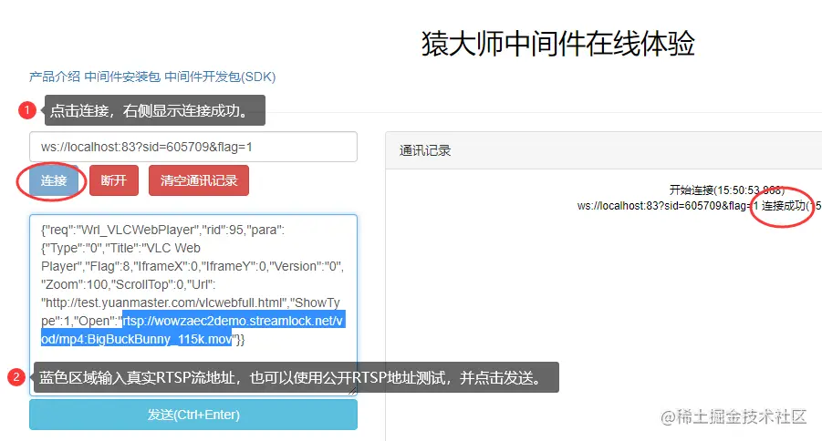 首先点击连接,右侧会显示连接成功,如果没有成功,请确认本机83端口是否被占用,如果被占用。然后再把真实RTSP地址替换到下面蓝色区域,然后点击发送即可。