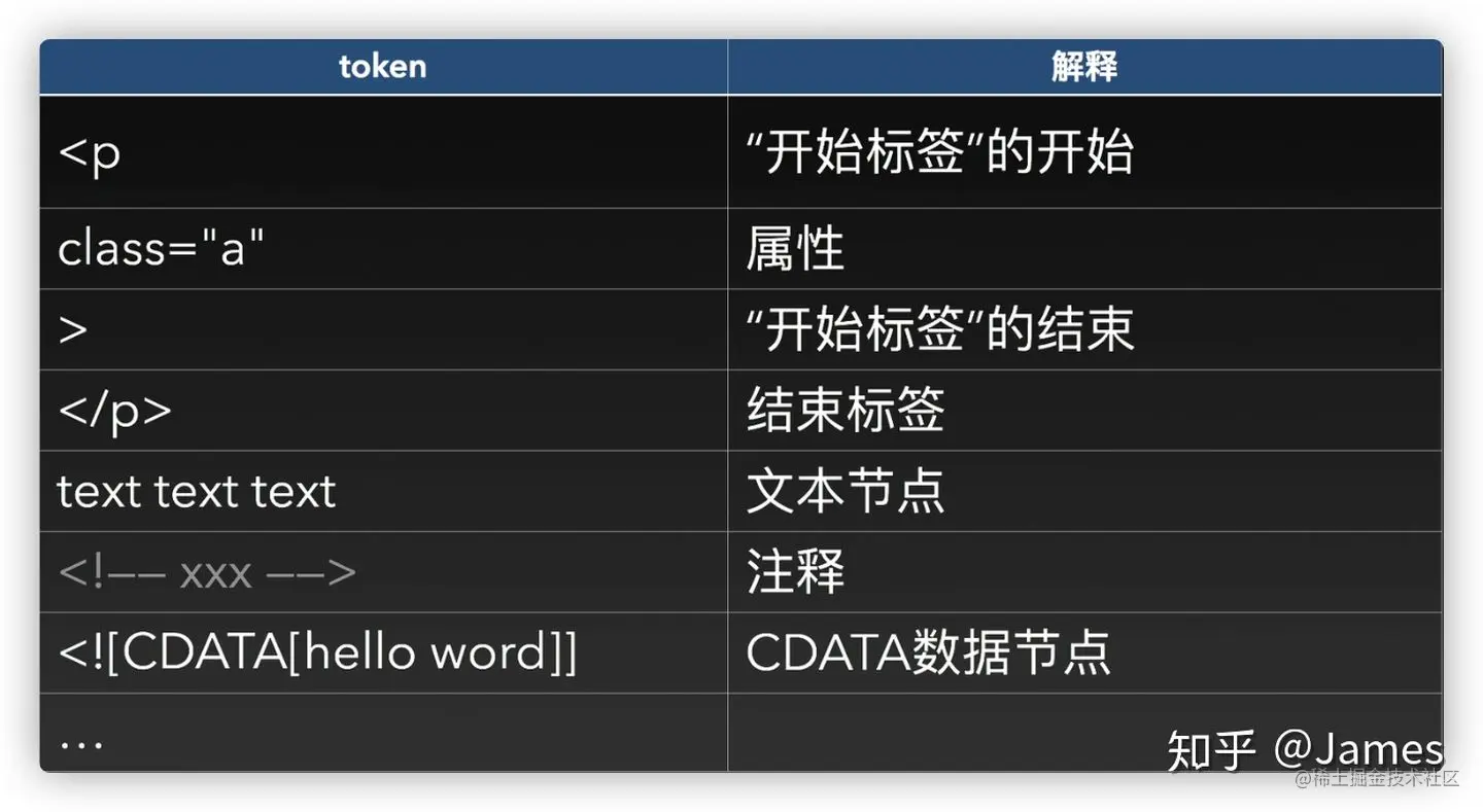 <p class="a">text text text</p>,当我们匹配到<我们并不知道它是哪一个token,继续匹配下一个字符<p,这时我们知道这时这个是p标签的开始的token,按照这种方式根据不同的token规则将字符串全部转化成token,如图 - 3:根据令牌生成对应dom节点