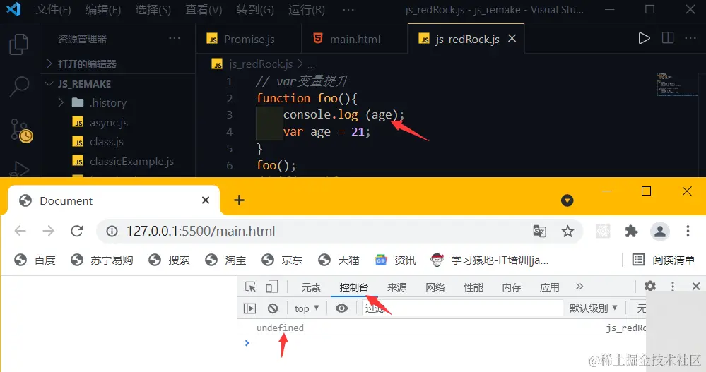 显然,变量age出现了变量提升,因为如果不提升,那么在打印age时就会报错,但是奇怪的是为什么打印的结果是undefined呢?原因在于,提升的只有变量,而没有赋值操作。下面的代码和上面等价。