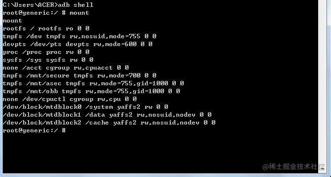 运行之后,什么结果也没有,那就是命令执行正确了。可以在文件系统(adb shell)窗口,再输入:mount;查看获取/system的读写权限,运行结果如下: