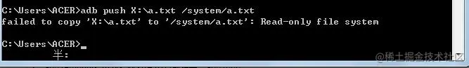 那如果想向/system中写入一个a.txt文件呢,于是在cmd窗口输入:adb push X:\a.txt /system/a.txt,运行结果如下: