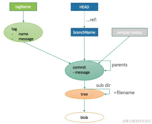 - 黄色的是提交对象(commit); 它指向一个树对象, 并且它可以和父提交相关联, 还能可以描述本次提交的信息(提交信息, 作者信息,时间等);