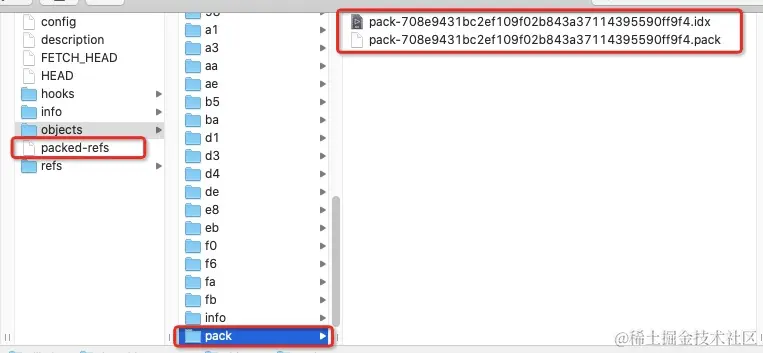 (上图中, packed-refs 是对引用的压缩打包, objects/pack文件下pack-hash值开头的两个文件: 以idx结尾的就是索引文件, 以pack结尾的就是包文件它里面存储了真正的数据对象, 需要索引文件才能解析获取到;)