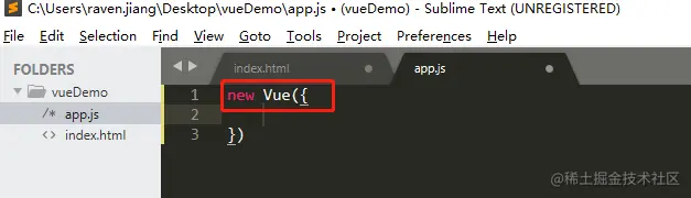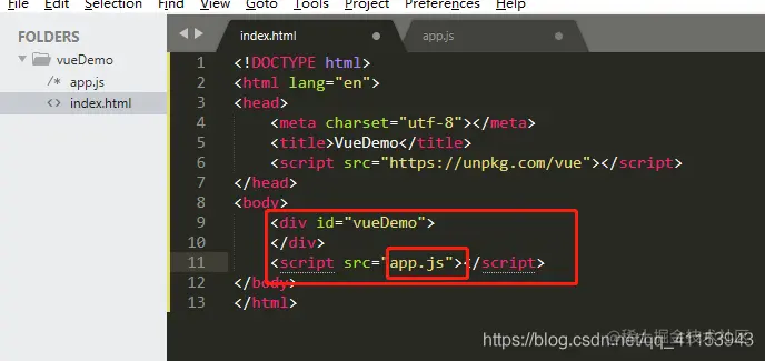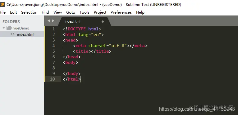 首先在桌面(或者任意位置)新建一个vueDemo的文件夹,并且用sublime(或者任意文本编辑器)打开,打开结果如下所示,