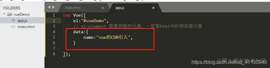 然后新建一个app.js文件,并且在html文件中的script的src中引入,表示app.js是一个根容器。